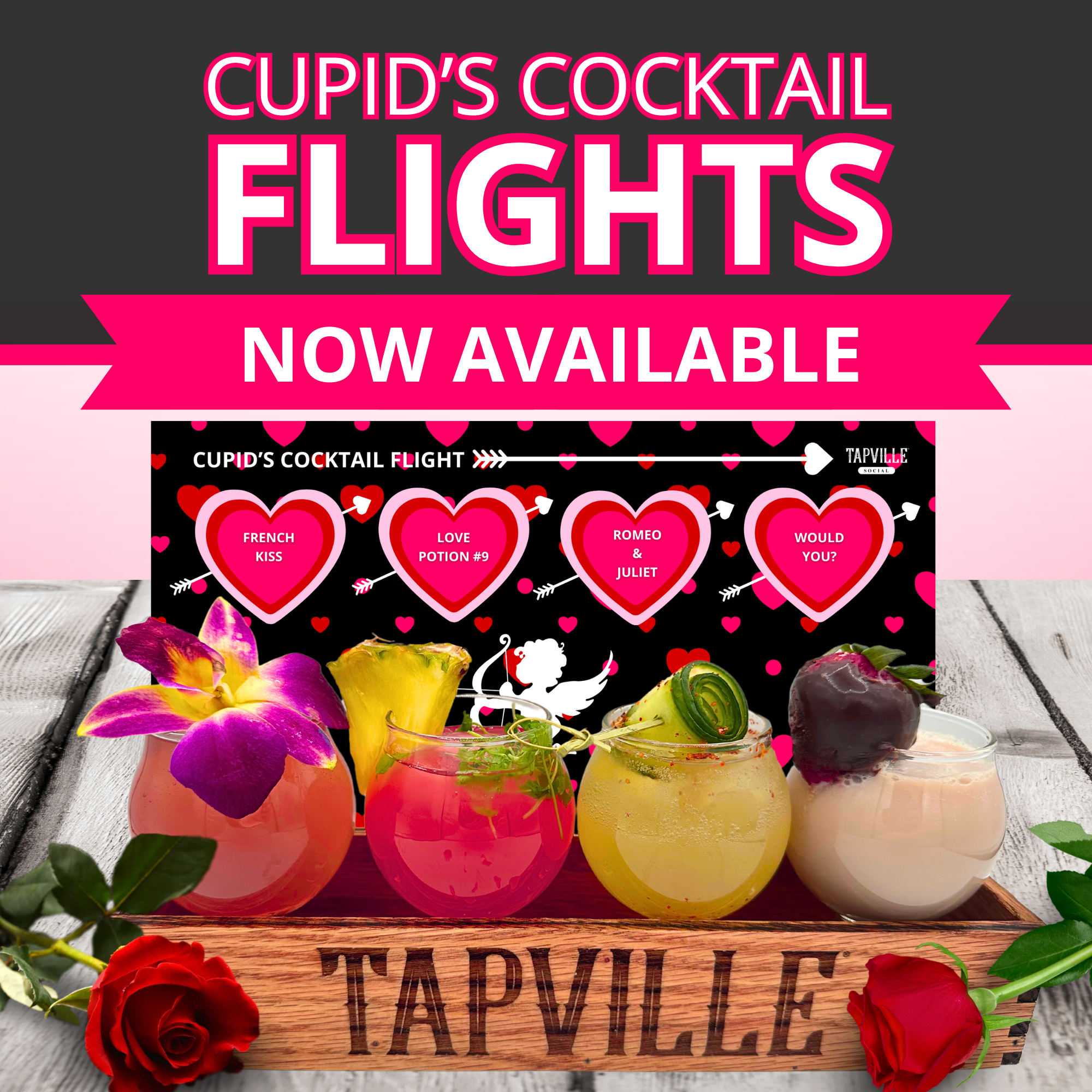Fall head over heels with our Cupid’s Cocktail Flight featuring French Kiss, Love Potion #9, Romeo & Juliet, and Would You? This collection of flirty, fruit forward, and sparkling sips is crafted to take you on a journey through love.